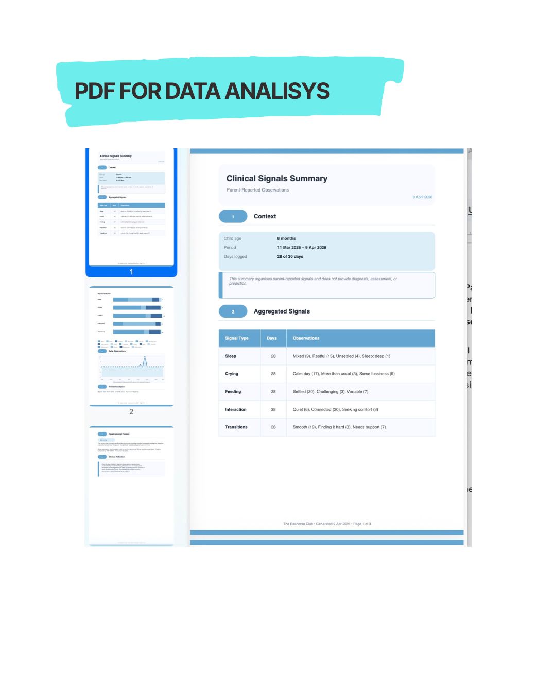 The Clinical Summary is a professionally structured PDF report designed to support conversations between parents and healthcare providers. It compiles parent-reported observations over a configurable period (3 days for free users; 30 days, 3 months, or 1 year for premium subscribers).